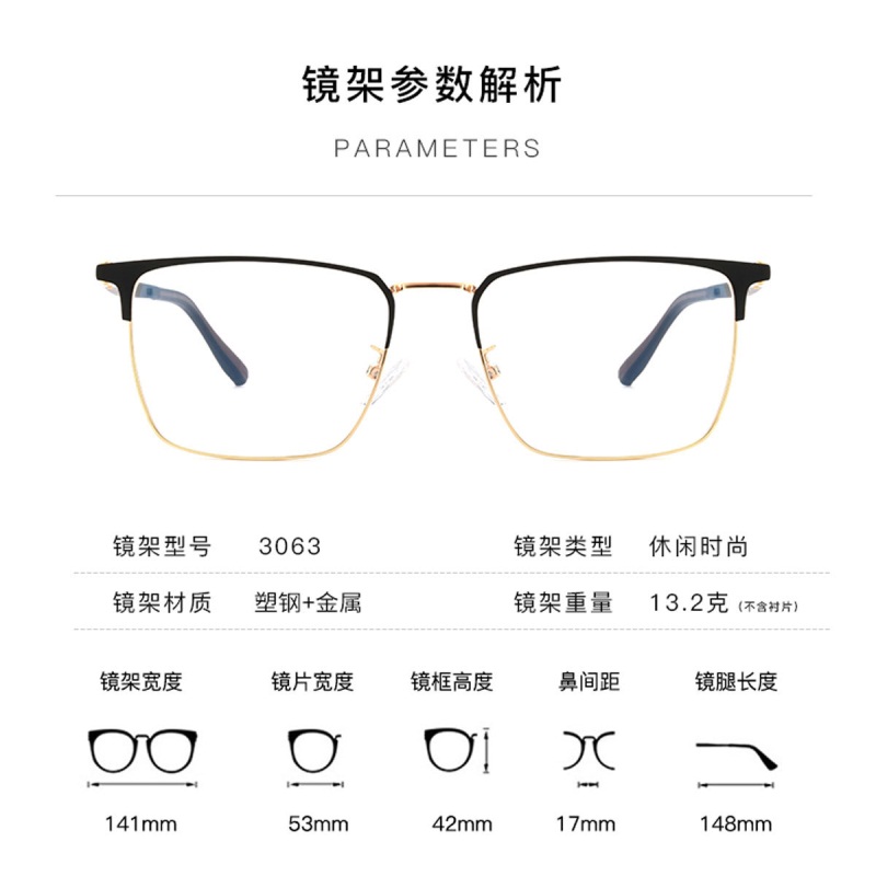 Attribute Product Category: reading glasses number of degrees: not have material: Plastic steel+metal style: Full framework Glasses style: box Suitable for face shape: Big face For the crowd: general Mirror frame material: Plastic steel+metal style: delicate Brand: 菲利莱 Tip: Click the image to translate text.