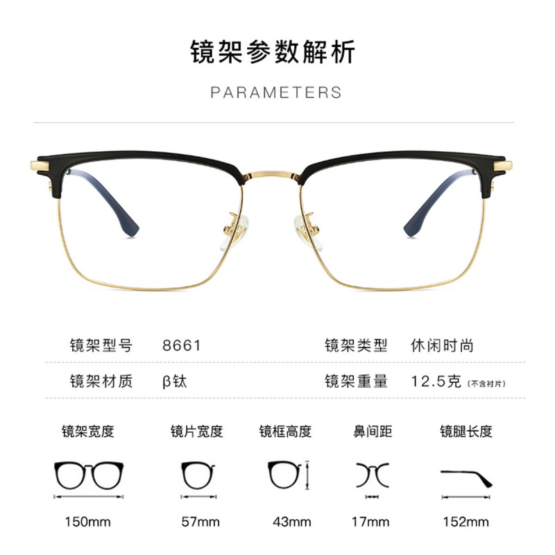 Attribute pattern: men's material: Half titanium style: Full framework Glasses style: box Suitable for face shape: Big face For the crowd: general Mirror frame material: Half titanium style: delicate Brand: 菲利莱 Tip: Click the image to translate text.