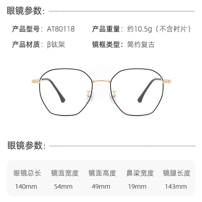 Attribute style: Full framework Glasses style: polygon Suitable for face shape: round face For the crowd: general Mirror frame material: Half titanium style: Retro specifications: 54 mouths 19-143 Brand: 安藤百福 Tip: Click the image to translate text.