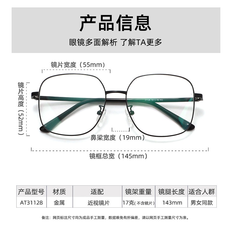 Attribute style: Full framework Glasses style: box Suitable for face shape: Big face For the crowd: general Mirror frame material: Plate+metal style: literature and art specifications: 55 mouths 19-145 Brand: 安藤百福 Tip: Click the image to translate text.
