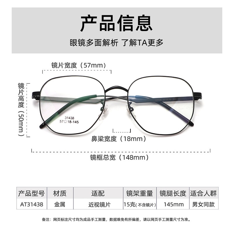 Attribute style: Full framework Glasses style: polygon Suitable for face shape: Big face For the crowd: general Mirror frame material: Plate+metal style: Retro specifications: 57 mouths 18-148 Brand: 安藤百福 Tip: Click the image to translate text.