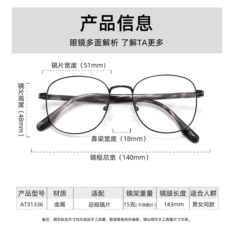Attribute style: Full framework Glasses style: polygon Suitable for face shape: Big face For the crowd: general Mirror frame material: Plate+metal style: literature and art specifications: AT31336 Brand: 安藤百福 Tip: Click the image to translate text.