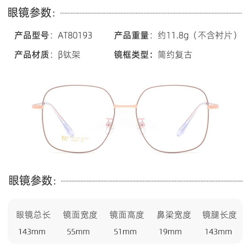 Attribute style: Full framework Glasses style: polygon Suitable for face shape: Big face For the crowd: general Mirror frame material: Half titanium style: trend specifications: 55 mouths 19-143 Brand: 安藤百福 Tip: Click the image to translate text.