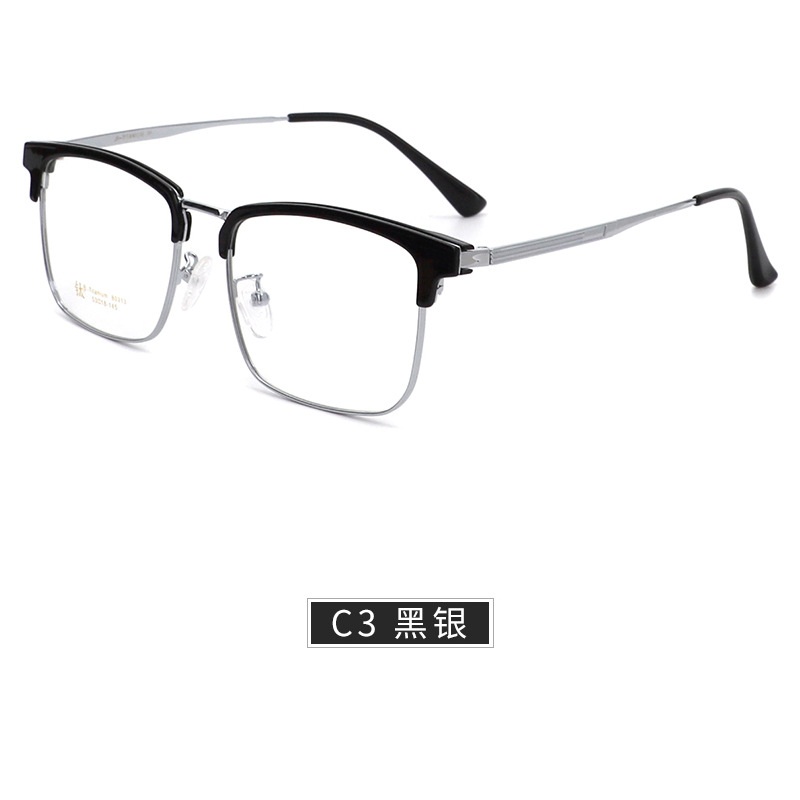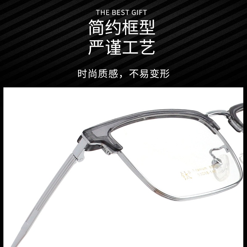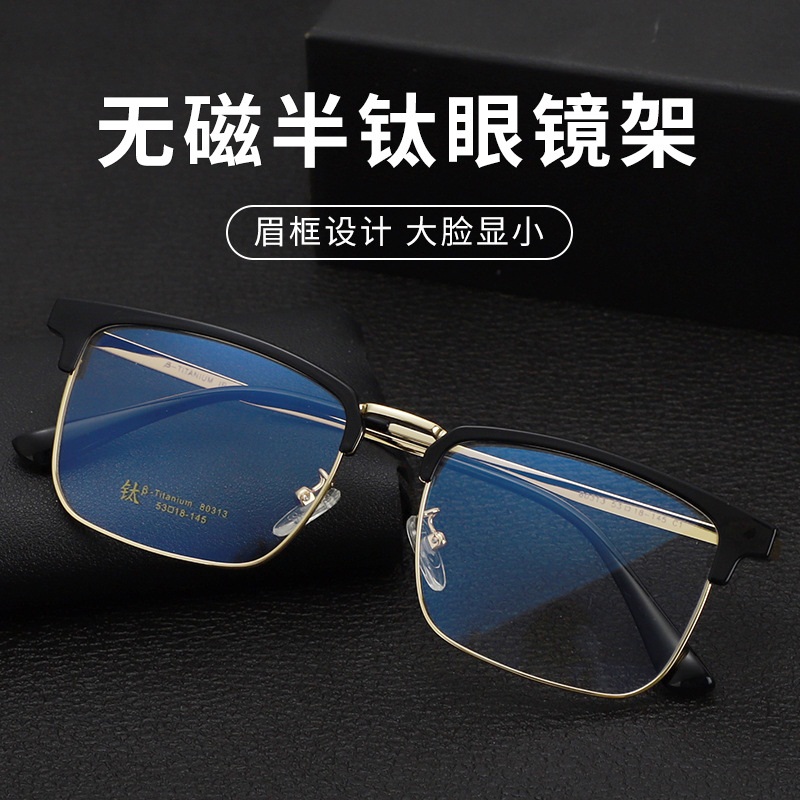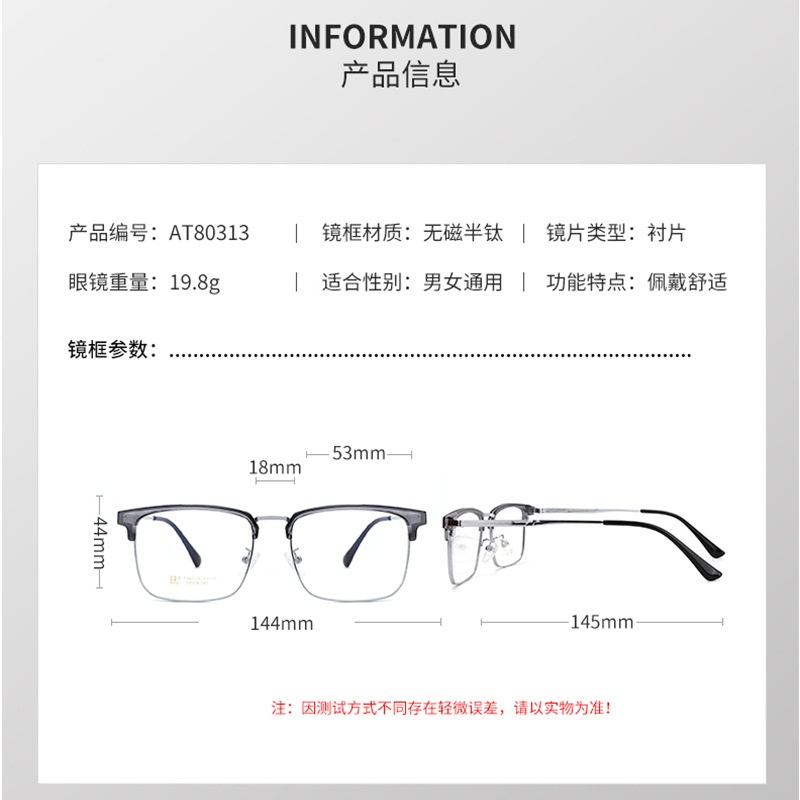 Attribute style: Full framework Glasses style: box Suitable for face shape: Big face For the crowd: general Mirror frame material: Half titanium style: commercial affairs specifications: 53 mouths 18-145 Brand: 安藤百福 Tip: Click the image to translate text.