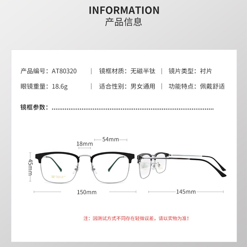 Attribute style: Full framework Glasses style: Box Suitable for face shape: Big face For the crowd: currency Mirror frame material: Half titanium style: business affairs specifications: 54 mouths 18-145 Brand: 安藤 Tip: Click the image to translate text.