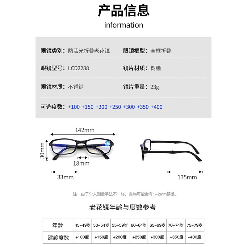 Attribute Product Category: reading glasses style: Full framework Glasses style: box Suitable for face shape: Small face For the crowd: general Mirror frame material: TR90 style: simple Brand: 未设置品牌 Tip: Click the image to translate text.